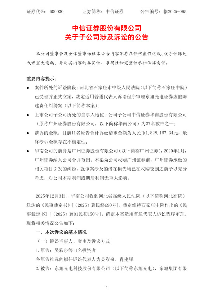 中信证券12月4日晚发布公告称,子公司中信证券华南股份有限公司因牵涉东旭光电证券虚假陈述责任纠纷案,被列为37名被告之一,涉诉金额182.82万元。该案已确定适用普通代表人诉讼程序审理,引发市场关注。